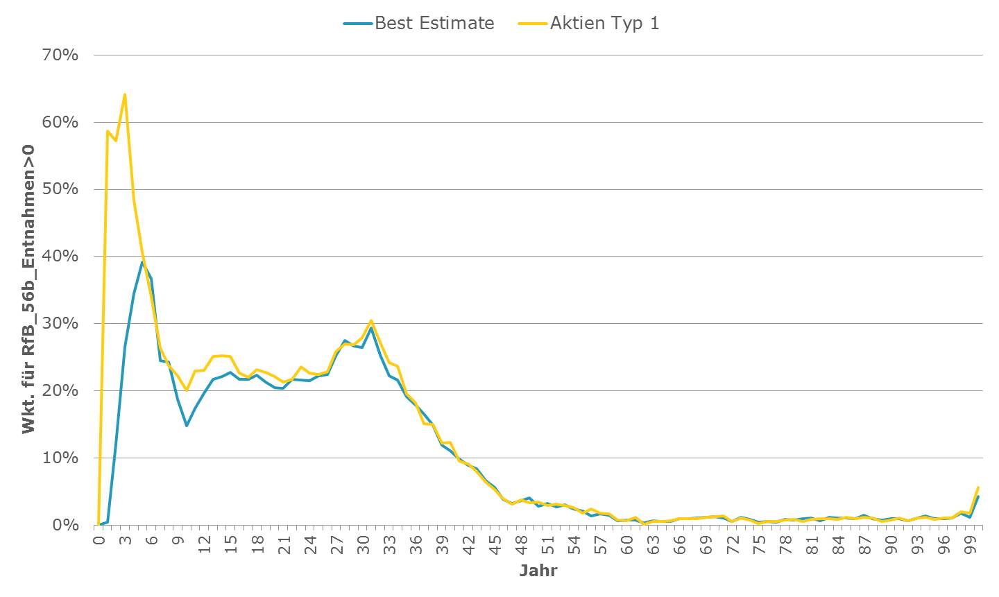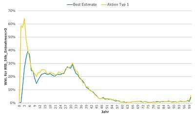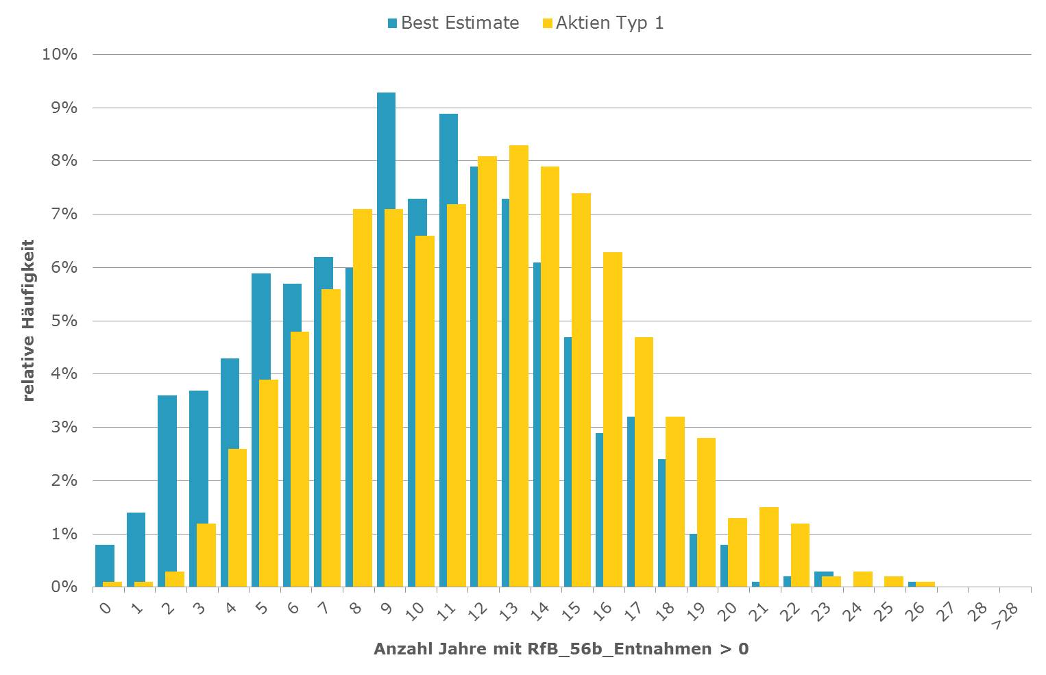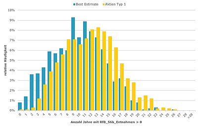 Beispielhaft sind nachfolgend Auswertungen zur relativen Häufigkeit (Abbildung 1) und dem zeitlichen Verlauf (Abbildung 2) von RfB-Entnahmen gem. § 56b VAG für den Best Estimate (blau) im Vergleich zum Stress-Szenario Aktien Typ 1 (gelb) dargestellt.